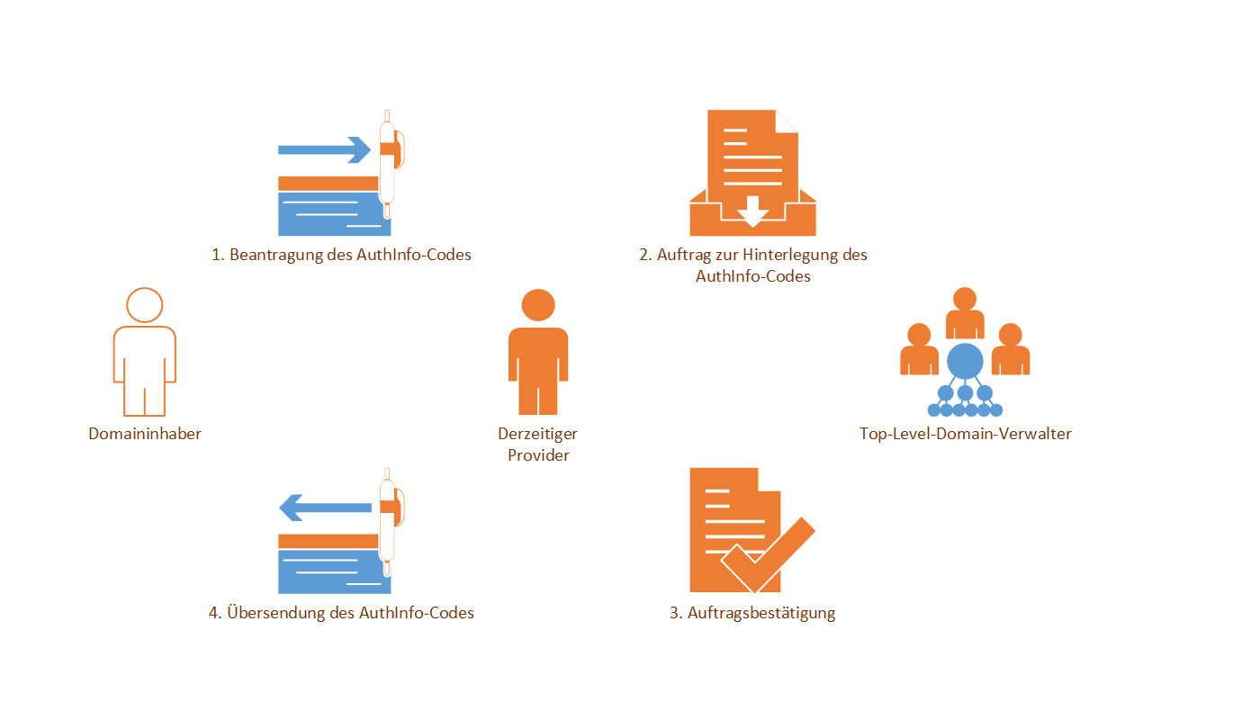 Möchten Sie eine Domain von einem Provider zum anderen Provider transferieren, benötigen Sie einen Auth-Code. Der Provider, welcher die Domain verwaltet, ist zur Herausgabe des Codes, gegenüber dem Domaininhaber oder dessen Vertreter, verpflichtet. In der Regel bietet die Verwaltungsoberfläche des ursprünglichen Providers eine Möglichkeit diesen Auth-Code zu generieren. Falls dies nicht der Fall ist, muss der Provider über die üblichen Kanäle kontaktiert werden. Jedoch kann es unter umständen sein, dass der ursprüngliche Provider nicht mehr existiert bzw. nicht reagiert. Sollte dies der Fall sein und die zu übertragende Domain ist eine .DE-Domain, schauen weiter unten nach. Bei anderen Top-Level-Domains bieten wir diesen Service leider nicht an. Weiterhin möchten wir sie darauf aufmerksam machen, dass es in Ihrem Interesse ist, die Domaindaten nach einem evtl. Umzug entsprechend korrigieren zu lassen.